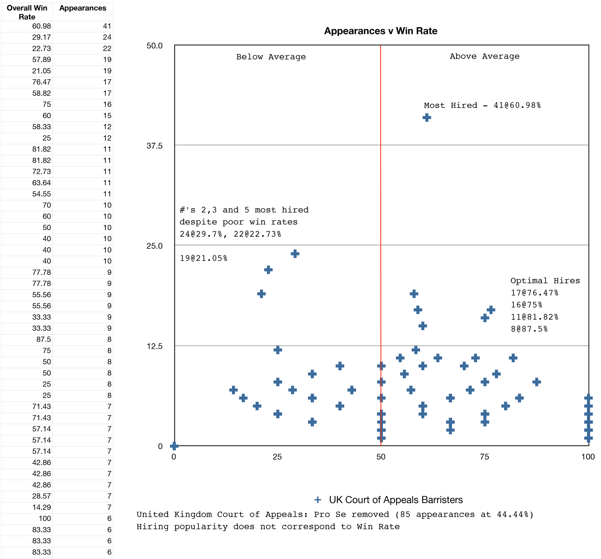 How good are Attorneys? “It’s a complicated question. They themselves don’t know and it differs per Judge.” says Unwin. “We’ve found that peer recognition and billing rate aren’t correlated with Courtroom success. The top UK law firms consistently re-hire proven losers because, until now, nobody’s been keeping score.”