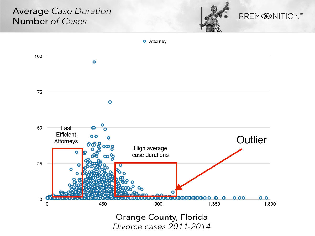 The answer, according to legal analytics firm, Premonition LLC (www.premonition.ai), very much depends on your choice of Attorney. Premonition recently completed a study of 24,507 divorce cases from 2011-2014 at the Orange County Courthouse in Orlando, Florida. “Divorce cases are useful to compare. While some are undoubtedly more complicated than others, or have more intransigent parties, at the end of the day, they all boil down to filling out 2 forms at the Courthouse. Pretty much everything else is at the discretion of the Attorneys involved. Over thousands of cases these differences get smoothed out and clear patterns emerge.” says Toby Unwin, Co-founder & Chief Information Officer of Premonition.