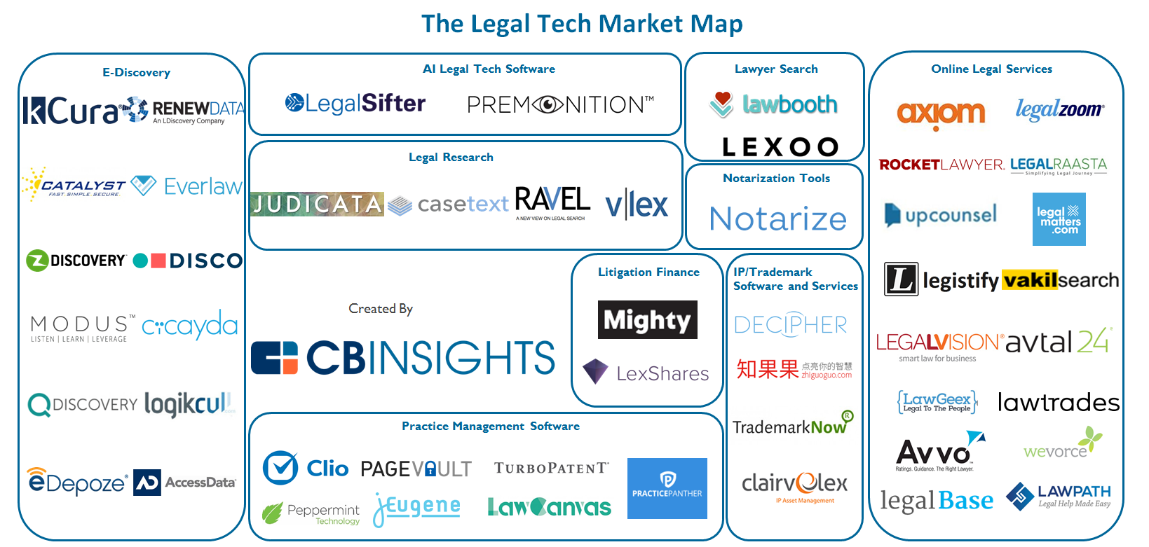 Using CB Insights and analytics, we identified 50 startups working in legal tech, and categorized them into a market map spanning key emerging categories such as electronic discovery, law practice management, and online legal services.
