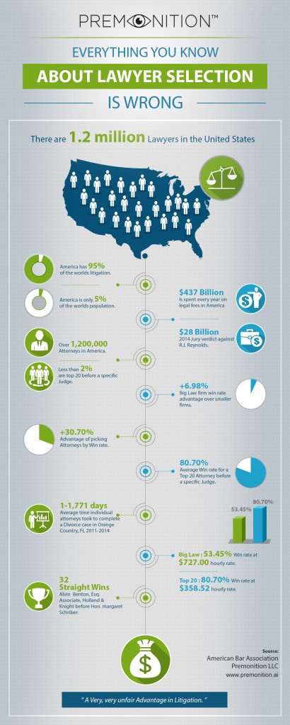 This has all changed with the advent of legal analytics (also known as Big Data). Start-ups like Premonition, Lex Machina and IBM’s ROSS AI have made it possible to query vast amounts of litigation data and legal analytics in a matter of seconds, revealing the real performance of lawyers. Premonition, a Miami-based firm which claims to have assembled the world’s largest database of court records, emphasizes the potential of what it calls perception-reality arbitrage. If most clients share the flawed conventional wisdoms embodied by the legal directories, it follows that those with access to more empirical data are well-positioned to take advantage of the gaps between that wisdom and the truth. Premonition’s research has shown that while choosing the optimal available lawyer for the circumstances of a given case (factoring in jurisdiction, case type and judge) has a 30.7% impact on a client’s chances of winning, even law firms themselves are actually quite poor at selecting the attorneys most likely to win cases. Legal directories, which are sourced from the opinions of these very firms, are an embodiment of this flawed reasoning.