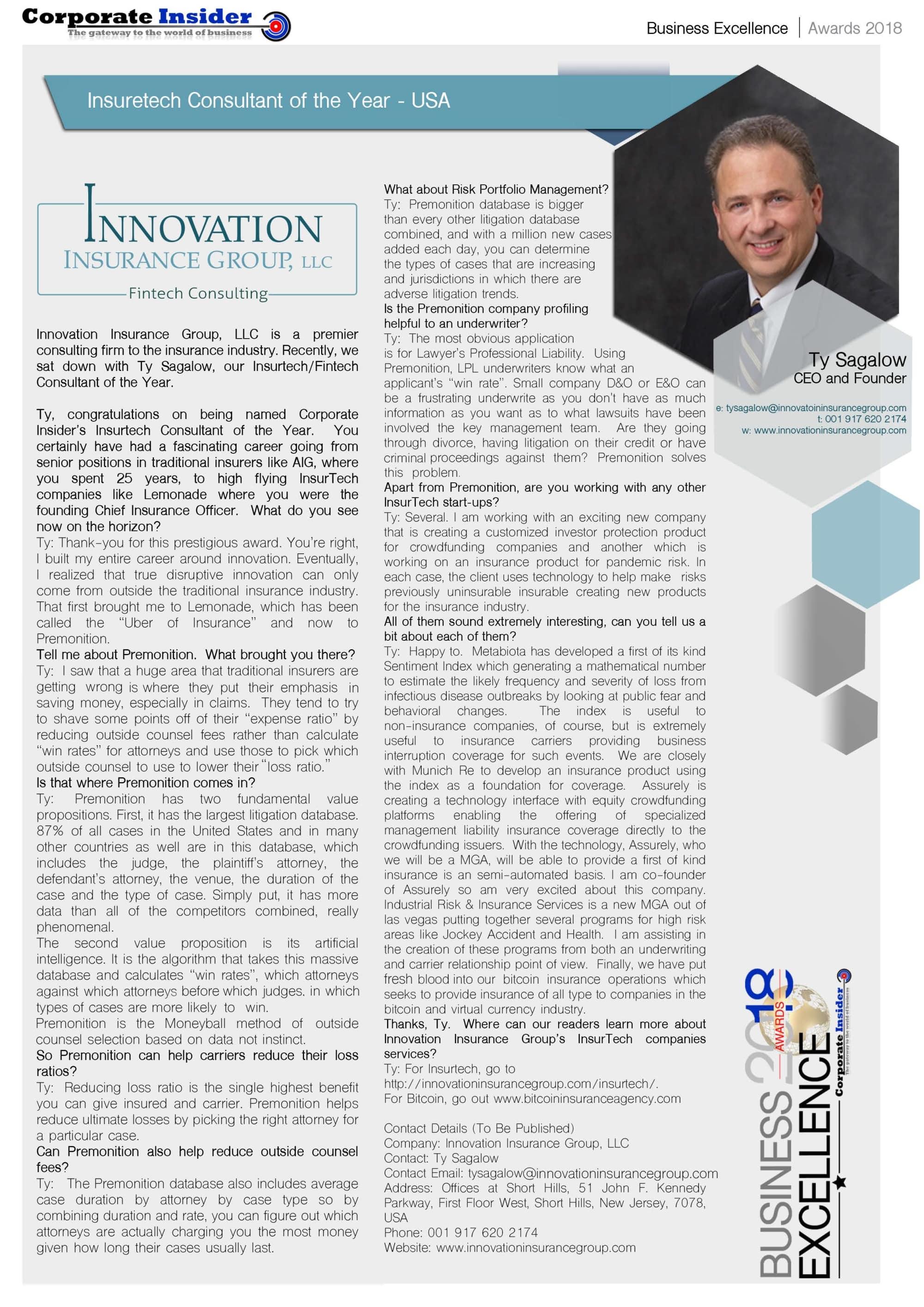 Coming off the heels of his 2017 InsurTech Consultant of the Year Award from Acquisition International, Ty Sagalow, Premonition’s Chief Insurance Officer was the 2018 InsurTech Consultant of the Year from Corporate Insider. In Corporate Insider’s interview with Mr. Sagalow, he talks about why he joined Premonition and how he sees the future of LegalTech.